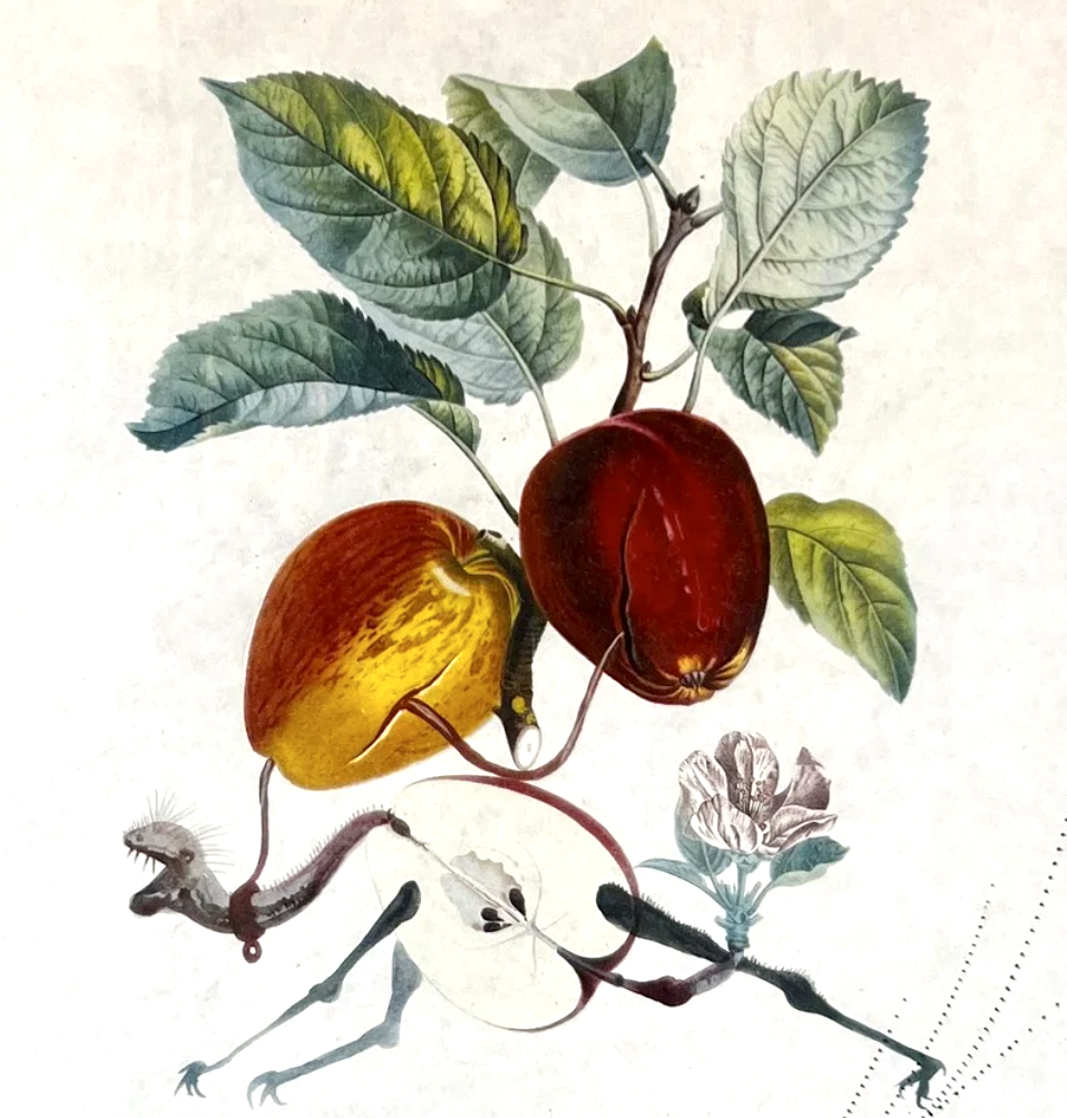 The Floradali series is one of Salvador Dalí’s most poetic and enigmatic cycles, where the world of flora becomes a stage for metaphysical transformation. In Dragon Apple, the artist merges two opposing forces — fruit and beast, life and destruction, temptation and danger.