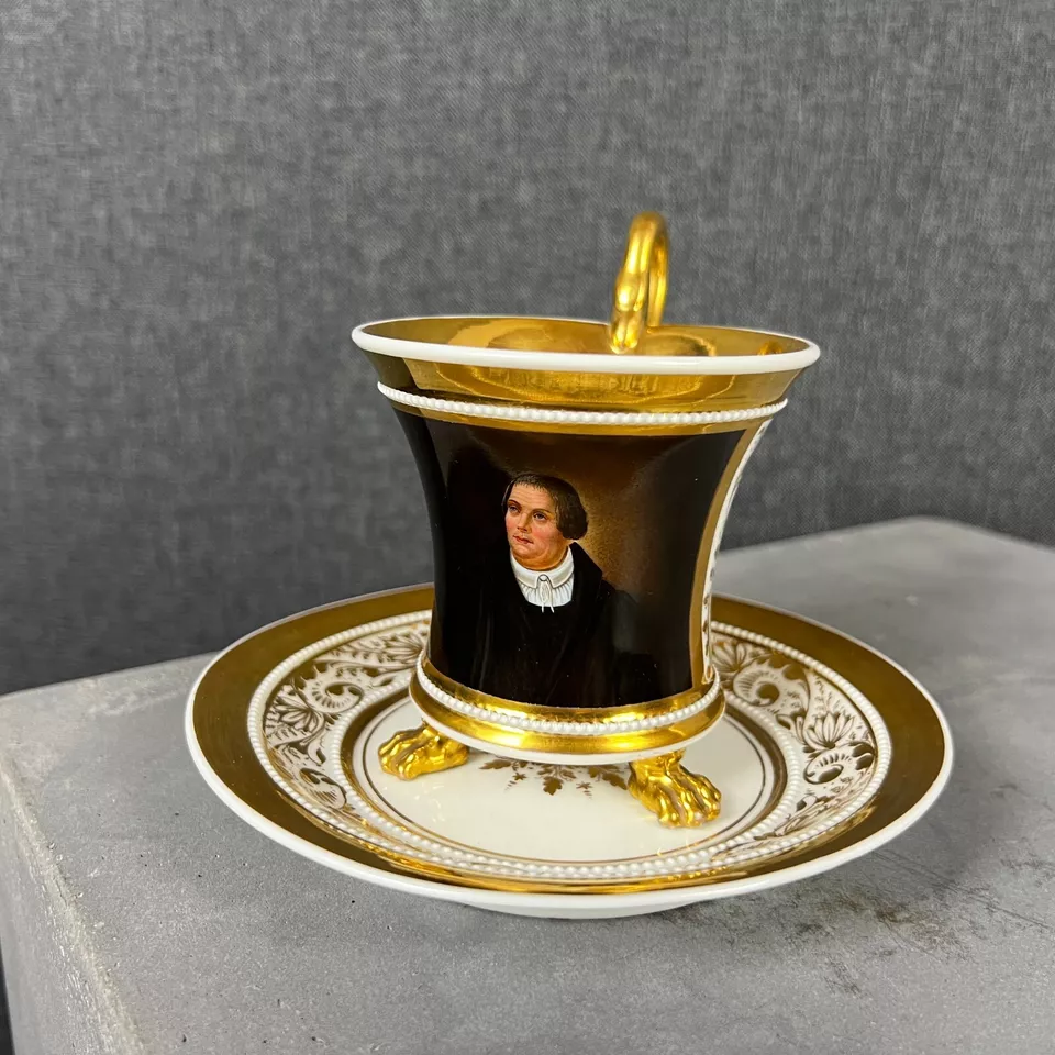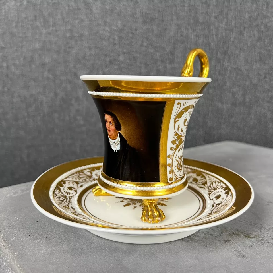 An important KPM Berlin Germany porcelain cup and saucer depicting a portrait of Martin Luther. 1st quality, flawless condition Size: Saucer: 16cm diameter Cup: 12 x 12 cm Manufactured in ca. 1830 Exceptional cup for its artistic values and historical significance. Martin Luther (1483 – 1546) was a German priest, theologian, author, hymn-writer, professor, and Augustinian friar. Luther was the seminal figure of the Protestant Reformation, and his theological beliefs formed the basis of Lutheranism. He is widely regarded as one of the most influential figures in Western and Christian |